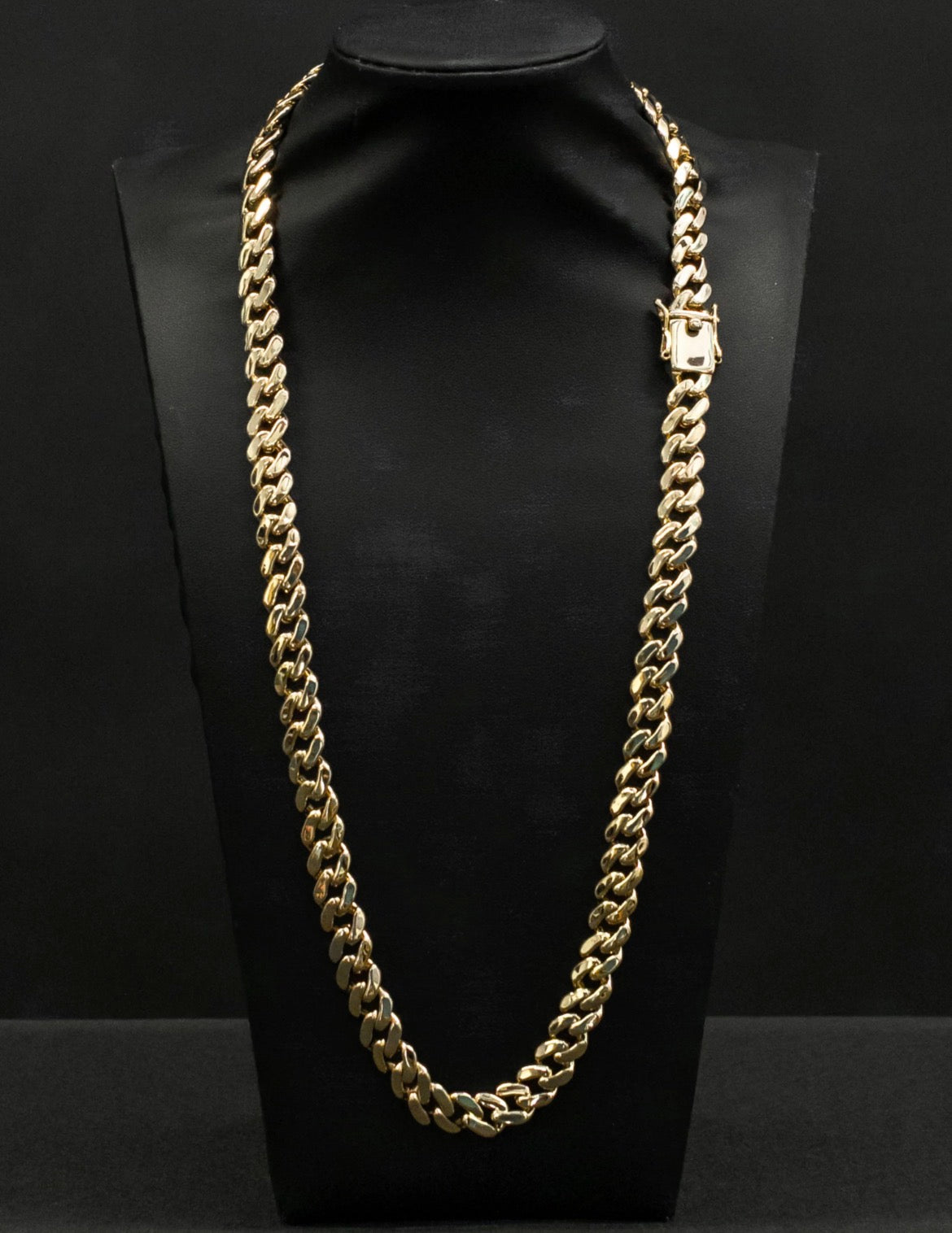 Elevate your style with this 10mm 9ct Gold Filled Cuban Chain, a piece that perfectly balances classic design with premium craftsmanship. Crafted from the finest materials, this chain features a secure prong clasp, ensuring a reliable and comfortable fit. The heavy 9ct gold filled finish provides a luxurious appearance, making it a standout accessory for any occasion. Available in both 24-inch and 30-inch lengths, this Cuban chain is the epitome of timeless elegance and quality.